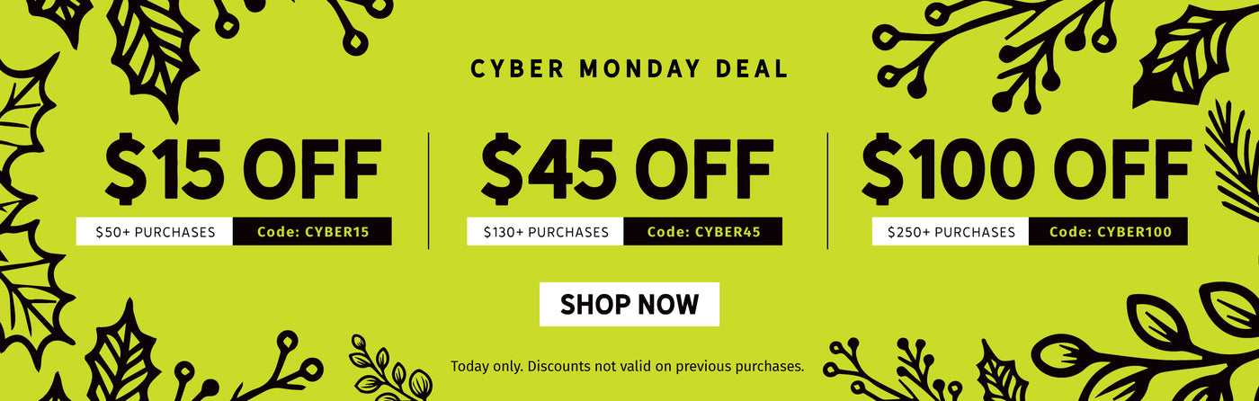$15 Off of $50+ Code: CYBER15 I $45 Off of $130+ Code: CYBER45 I $100 Off of $250+ Code: CYBER100